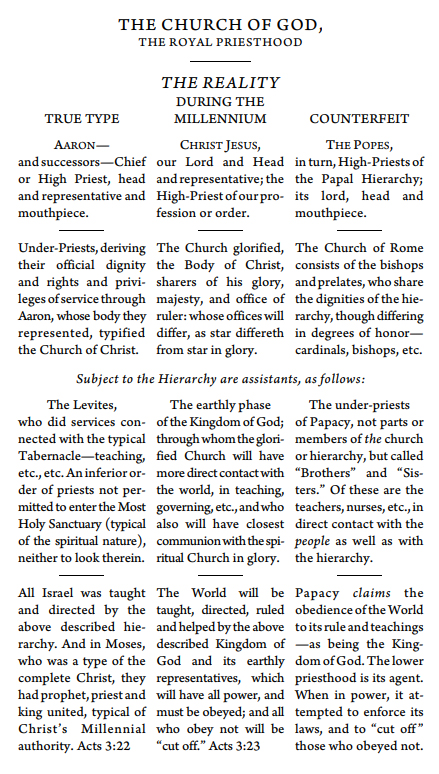Claims like these are very generally passed over lightly by prophetic students and writers, while they search out and specially notice immoralities; but herein they greatly err, for criminalities have been plentiful enough in every age, and would need no such special, prophetic delineations as are given of Antichrist. Could it be proved that those connected with the papal system have been very models of morality, it would be none the less identical with the character [B301] noted in Scripture as the great Antichrist—the counterfeit which has arrogated to itself the titles, privileges, powers and reverence belonging to the Lord's Anointed. As a counterfeit, it has also misrepresented the plan of God with reference to the selection of a "little flock," or Church, in the present time; and it has entirely set aside the real hope of the Church, and the Lord's provision for the blessing of the world during the Millennial reign of Christ—which it represents as fulfilled in its own reign.